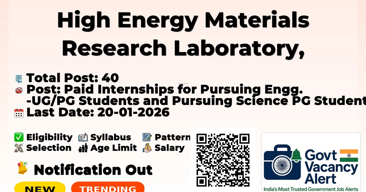 High Energy Materials Research Laboratory (DRDO HEMRL) has released an official notification for the recruitment of 40 Paid Internship Posts. Interested and eligible candidates can apply Offline through the official DRDO HEMRL website. The last date to submit the application form is 20-01-2026. In this article, you’ll find the DRDO HEMRL Paid Internship Posts recruitment details, including eligibility criteria, age limit, salary structure, selection process, application steps, and direct links to the official notification and Offline application form.