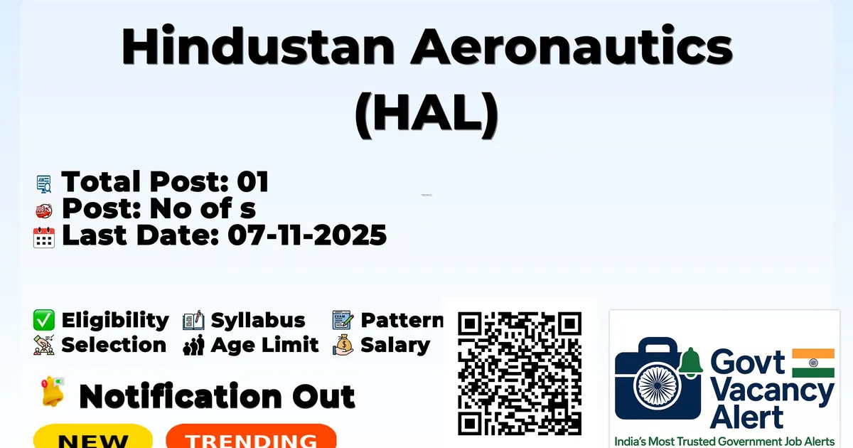 Hindustan Aeronautics (HAL) has released an official notification for the recruitment of 01 Visiting Consultant Posts. Interested and eligible candidates can apply Offline through the official HAL website. The last date to submit the application form is 07-11-2025. In this article, you’ll find the HAL Visiting Consultant Posts recruitment details, including eligibility criteria, age limit, salary structure, selection process, application steps, and direct links to the official notification and Offline application form.