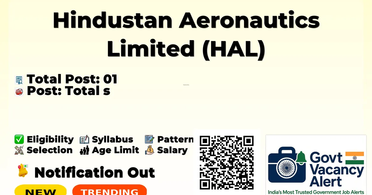 Company Name Hindustan Aeronautics Limited (HAL) Post Name Part-Time Doctor (Factory Dispensary) No of Posts 01 Salary 48,230/- Per Month (Consolidated) Qualification MBBS with valid MCI/State Medical Council Registration Age Limit Upper age limit 65 Years (as on 27/11/2025) Walk-in Interview Date 05/12/2025 at 09:30 hrs Official Website www.hal-india.com