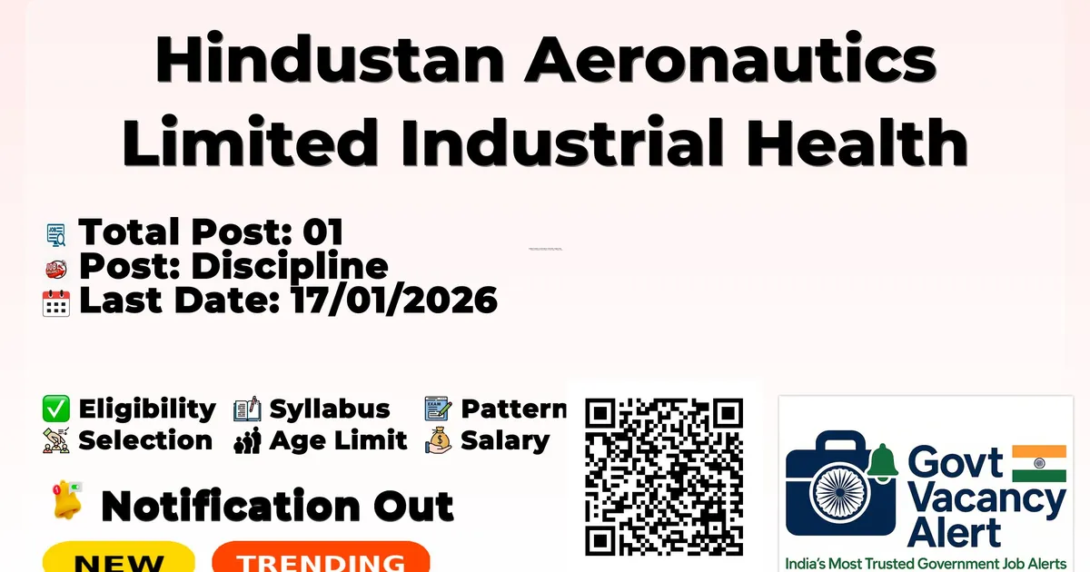 Hindustan Aeronautics (HAL) has released an official notification for the recruitment of 01 Visiting Consultant Posts. Interested and eligible candidates can apply Offline through the official HAL website. The last date to submit the application form is 17-01-2026. In this article, you’ll find the HAL Visiting Consultant Posts recruitment details, including eligibility criteria, age limit, salary structure, selection process, application steps, and direct links to the official notification and Offline application form.