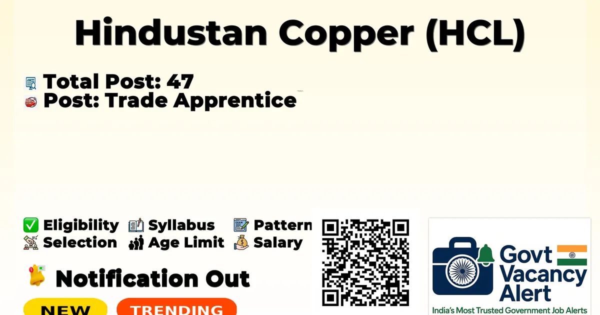 Hindustan Copper (HCL) has released an official notification for the recruitment of 47 Trade Apprentice Posts. Interested and eligible candidates can apply Online through the official HCL website. In this article, you’ll find the HCL Trade Apprentice Posts recruitment details, including eligibility criteria, age limit, salary structure, selection process, application steps, and direct links to the official notification and Online application form. Trending Govt Jobs India Post GDS Recruitment 2026 IAF Agniveer New Recruitment 2026 Yantra India YIL 3979 Trade Apprentices Online Form 2026 RRB 22000 Group D Online form 2026 RBI 572 Office Attendant Online Form 2026 Advertisement Company Name Hindustan Copper (HCL) Post Name Trade Apprentice No of Posts 47 Qualification ITI, 10TH Age Limit 18 to 25 years Date of the Employment Fair 04-02-2026 Official Website https://www.hindustancopper.com/ Free Online Mock Tests View all Railway NTPC Mock Test Attempt Now IBPS Clerk Mock Test Attempt Now SSC CHSL Mock Test Attempt Now View All Mock Tests Trade Total Blaster (Mines) 3 Driver Cum Mechanic (LMV) 6 Fitter 4 Turner 1 Welder (Gas & Electric) 8 Electrician 3 Draughtsman (Civil) 2 Computer Operator & Programming Assistant (COPA) 12 Instrument Mechanic 5 Solar Technician (Electrician) 3 Qualifications: Passed 10th / Matric exam under 10+2 system of education or its equivalent Essential qualifications: The candidate must possess requisite qualification as listed in the above table as on cut-off date. The candidate must be ITI passed from the respective trade for applying against Sl. No. 3 to 10. In case of Sl. No. 1 & 2, the candidate must be 10th pass. Experience: The candidates who have passed ITI in 2024 and prior to the year 2024 will have to produce an affidavit on non-judicial stamp paper sworn-in before a Magistrate or Notary Public to the effect that they have neither undergone apprenticeship training from anywhere earlier nor have taken employment anywhere. Stipend - As admissible under the rules. Minimum Age: 18 years Maximum Age: 25 years A relaxation of 5 years is admissible for SC/ST candidates and 3 years for OBC candidates in the upper age limit. All govt. guidelines on the matter will be observed. Event Date Date of Employment Fair 04.02.2026 Cut-off Date for Age, Qualification & in all other respect 04.02.2026 The candidates will be selected on the basis of merit based on their marks obtained in ITI & 10th. A weightage of 30% to marks scored in relevant trade in ITI & a weightage of 70% shall be given to marks scored in 10th board. In case where no ITI is required [Like in the trades of Blaster (Mines) & Driver Cum Mechanic (LMV)], 100% weightage will be given to marks scored in 10th Board. If two or more candidates secure equal marks while preparing merit list, then the candidate of higher age will be considered. Engagement of selected trade apprentices is subject to his / her being declared medically fit as per the requirement of the Company i.e. HCL. In case of CGPA in 10th / Matric exam it will be converted to equivalent percentage by multiplying CGPA with 9.5 while calculating the merit. Any amendment or update on this shall be communicated only through company website www.hindustancopper.com. Hence please keep on visiting the website from time to time for any update in future. The company reserves the right to increase or decrease the number of seats as per requirement. The candidature of applicant would be provisional and subject to subsequent verification of certificates and testimonials. In case, it is detected at any stage of engagement or thereafter, that a candidate does not fulfill the eligibility norms and or/ that he has furnished any incorrect / false information / fake certificate / fabricated documents or has suppressed any material fact, his / her candidature will stand cancelled. This is only an opportunity for getting trained for improving employability of the candidates and there is no scope for employment in HCL/MCP after completion of apprenticeship training nor can an apprentice claim right of employment on the grounds of completion of apprenticeship. The decision of The Management will be final and binding on all candidates on all matters relating to eligibility, acceptance or rejection of the applications, mode of selection, cancellation of selection process etc. No correspondence will be entertained in this regard. Candidates are advised to carefully read the full advertisement for details of educational qualifications and other eligibility criteria. Candidates are advised to register as a Trade Apprentice online in the following portals Interested Candidates have to appear and register themselves in the Rozgar Mela. Further candidates are required to register themselves and get it approved in advance in National Apprenticeship promotion Scheme (NAPS) web Portal[](https://www.apprenticeshipindia.gov.in). Apply Online: Click here Official Notification PDF: Click here Official Website: Click here Join Arattai Channel: Click Here Join Telegram Channel: Click Here Join WhatsApp Channel: Click Here Sarkari Result: Click Here Download Mobile App: Click Here