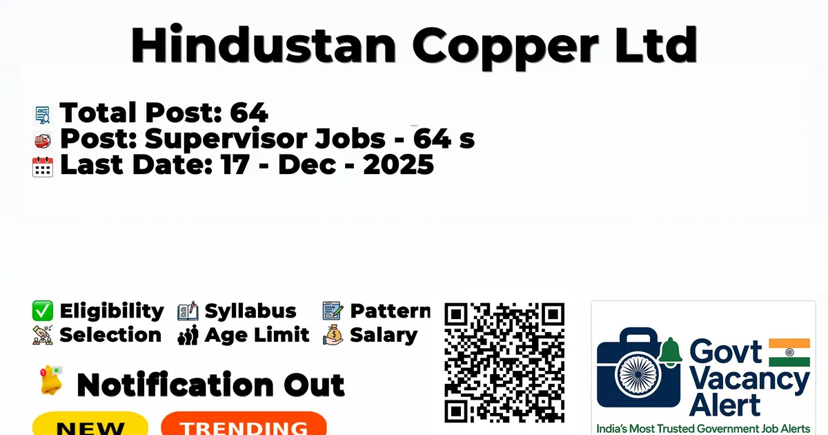 The Hindustan Copper Limited (HCL) has officially released the notification to fill the vacancies of 64 Supervisor Posts. Interested and eligibile candidates can use this opportunity to apply for these posts before the last date of application. Candidates who have completed their Any Degree, Post-graduation, B.E./B. Tech in Civil, Electrical, Mechanical Engineering, MBA, LLB, PGDM, and Diploma can apply for the HCL Notification 2025. The interested applicants can apply in online mode. Here we have mentioned the education details, age limit, selection process, application fee, salary, and how to apply for these posts before the deadline. The application dates have already begun.