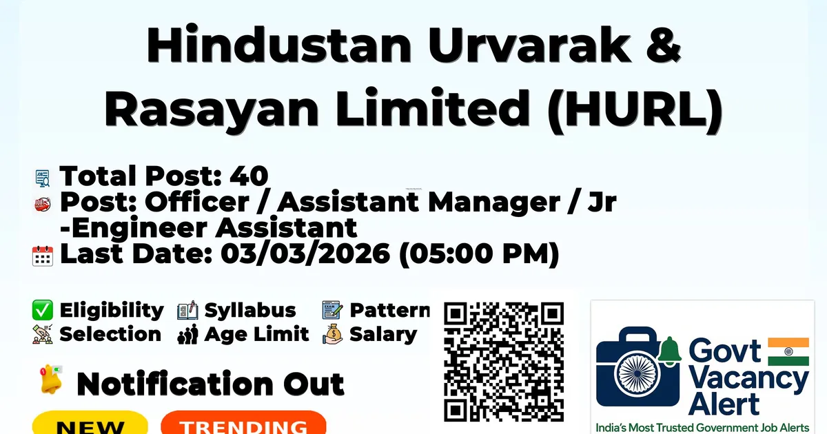 Hindustan Urvarak and Rasayan (HURL) has released an official notification for the recruitment of 40 Junior Engineer Assistant, Officer and Other Posts. Interested and eligible candidates can apply Online through the official HURL website. The last date to submit the application form is 03-03-2026. In this article, you’ll find the HURL Junior Engineer Assistant, Officer and Other Posts recruitment details, including eligibility criteria, age limit, salary structure, selection process, application steps, and direct links to the official notification and Online application form.