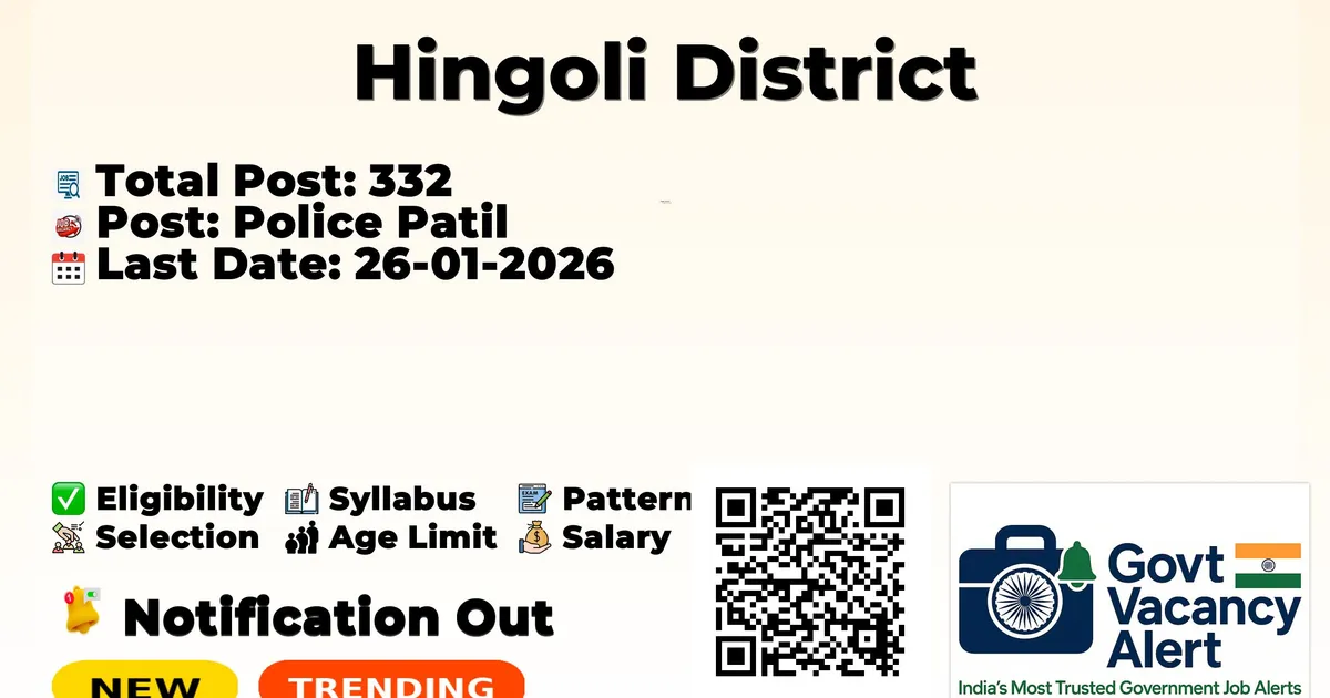 Company Name Hingoli District Post Name Police Patil No of Posts 332 Qualification 10TH Age Limit 25 to 45 years Start Date for Apply Online 12-01-2026 Last Date for Apply Online 26-01-2026 Official Website https://hingoli.nic.in/