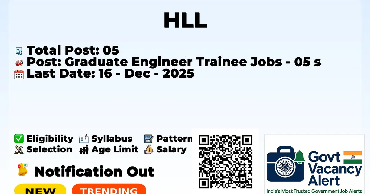 The HLL Lifecare Limited (HLL) has officially released the notification to fill the vacancies of 05 Graduate Engineering Trainee Posts. Interested and eligibile candidates can use this opportunity to apply for these posts before the last date of application. Candidates who have completed their B.E./B. Tech in Electrical, Civil, and Mechanical Engineering can apply for the HLL Notification 2025. The interested applicants can attend the walk-in interview. Here we have mentioned the education details, age limit, selection process, application fee, salary, and how to apply for these posts before the deadline. The application dates have already begun.