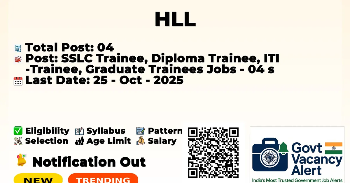 The HLL Lifecare Limited (HLL Lifecare) has officially released the notification to fill the vacancies of 04 SSLC Trainees, Diploma Trainees, ITI Trainees, and Graduate Trainees. Interested and eligibile candidates can use this opportunity to apply for these posts before the last date of application. Candidates who have completed their 10th pass, ITI, Diploma in Civil, Electrical, Electronics, and Mechanical Engineering can apply for the HLL Lifecare Jobs 2025. The interested applicants can attend the walk-in interview. Here we have mentioned the education details, age limit, selection process, application fee, salary, and how to apply for these posts before the deadline.