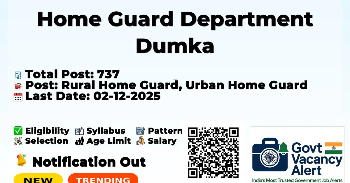 Home Guard Department Dumka has released an official notification for the recruitment of 737 Rural Home Guard, Urban Home Guard Posts. Interested and eligible candidates can apply Online through the official Home Guard Department Dumka website. The last date to submit the application form is 02-12-2025. In this article, you’ll find the Home Guard Department Dumka Rural Home Guard, Urban Home Guard Posts recruitment details, including eligibility criteria, age limit, salary structure, selection process, application steps, and direct links to the official notification and Online application form.