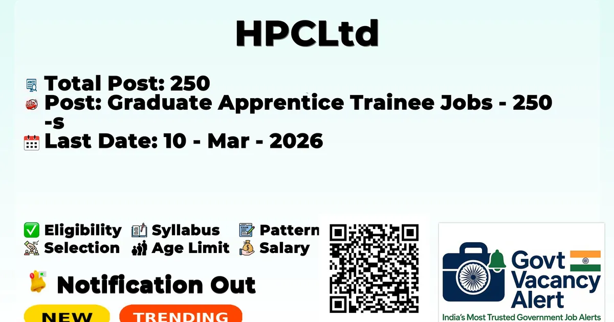 The Hindustan Petroleum Corporation (HPCL) has declared the official notification for 2026. To fill up the vacancies for 250 Graduate Apprentice Trainee Jobs. Those candidates who have qualified in the B.E/ B.Tech in Civil Engineering, Mechanical Engineering, and Electrical Engineering can grab this chance and apply for the HPCL Notification 2026. Here we included the age limit, selection process, salary structure, education details, application fee, and how to apply for these posts.