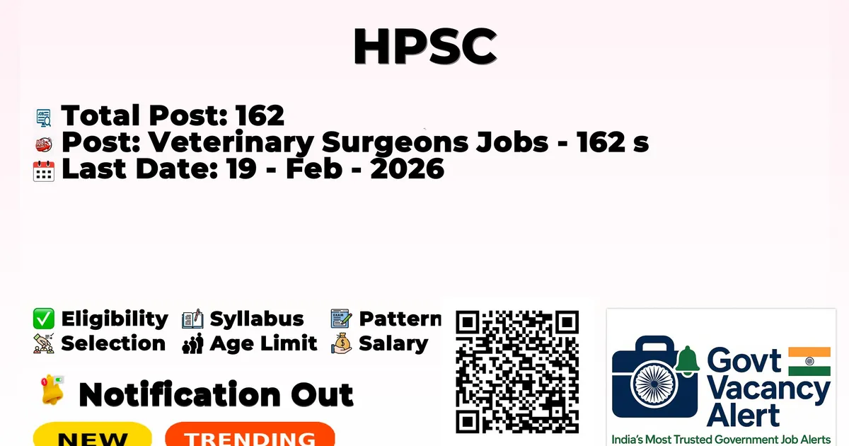 Haryana Public Service Commission (HPSC) has declared the official notification for 2026. To fill up the vacancies for 162 Veterinary Surgeons Jobs. Those candidates who have qualified for any degree, Ph.D can grab this chance and apply for the HPSC Recruitment 2026. Here, we included the age limit, selection process, salary structure, education details, application fee, and how to apply for these posts. Interested candidates can apply online before the last date of application.
