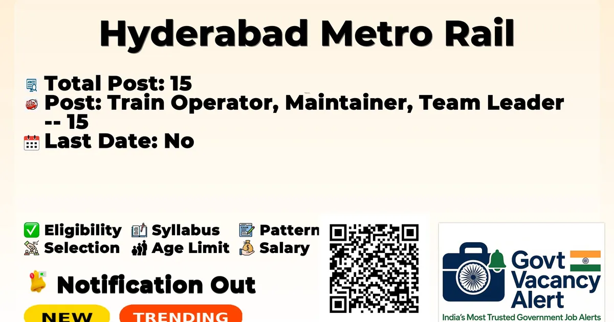 Hyderabad Metro Rail Recruitment 2025 of Team Leader, Engineer and Train Operator Vacancies: Keolis Hyderabad Mass Rapid Transit System Private Limited (Keolis Hyderabad) invites applications from eligible candidates for recruitment of following Team Leader, Engineer, Trainee Operator, Maintainer and System Analyst positions in Maintenance division. Job Position No of Vacancies Rolling Stock Team Leader 02 Rolling Stock Maintainer 04 Train Operator 09