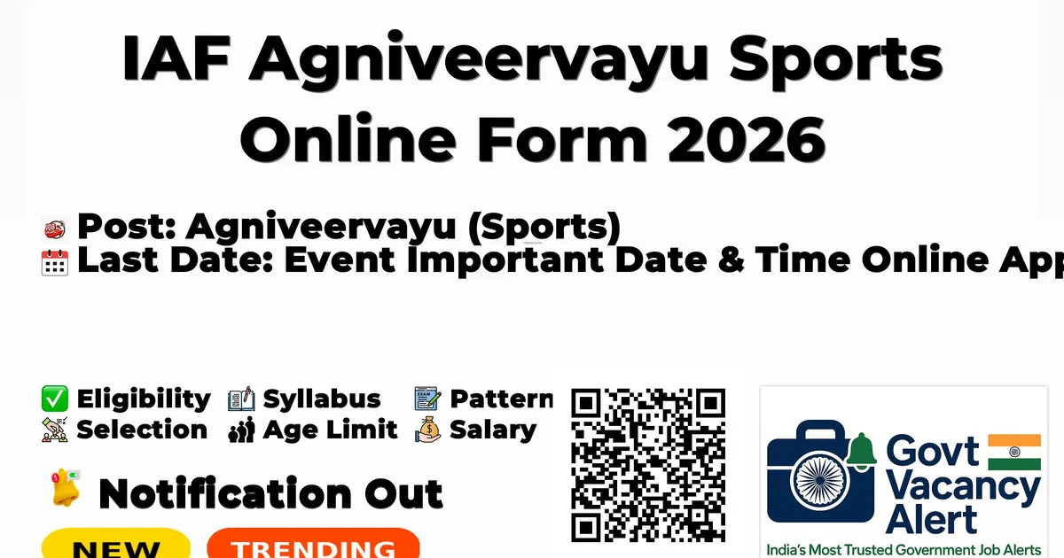 IAF Agniveervayu (Sports) Recruitment 2026 – Overview Recruitment Name Indian Air Force Agniveervayu (Sports) Intake 02/2026 Organization Indian Air Force (IAF) Scheme Agnipath Scheme – Agniveervayu (Sports) Post Name Agniveervayu (Sports) Who Can Apply Unmarried Indian male outstanding sportsmen in notified sports disciplines Application Mode Online only at agnipathvayu.cdac.in Selection Mode Physical Fitness Test, Sports Skill Trials and Medical Examination Engagement Period 4 years as Agniveervayu (Sports) under Air Force Act 1950 Job Location All India (as per Indian Air Force requirements) Official Website https://agnipathvayu.cdac.in