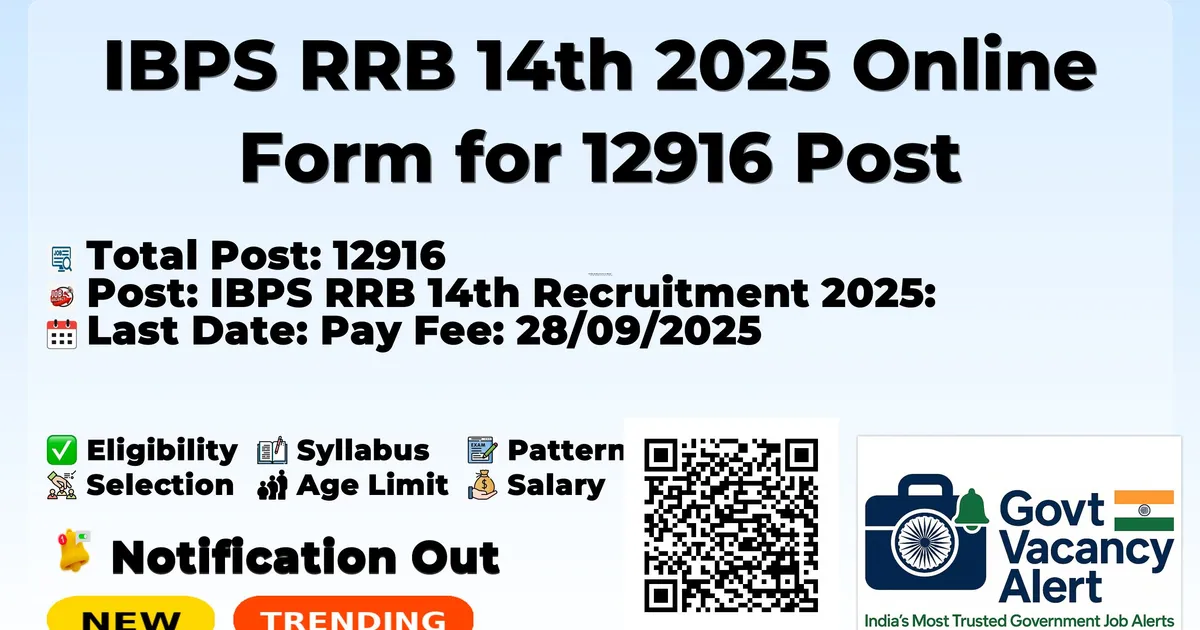 IBPS RRB XIV Recruitment 2025: Institute of Banking Personal Selection (IBPS) are invited to apply online application form for IBPS RRB 14th 2025 Online Form for 12916 Post. Other information related to this recruitment like selection procedure, pay scale, age limit, syllabus information is available in the notification (IBPS Rural Regional Bank RRB 14th Online Form 2025).