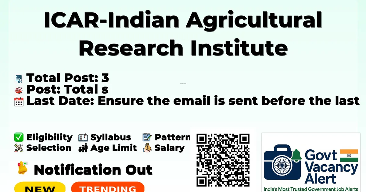 Company Name ICAR-Indian Agricultural Research Institute Post Name Research Associate / Senior Research Fellow No of Posts 3 Salary Rs. 58,000 + 27% HRA / Rs. 37,000 + 30% HRA Qualification Ph.D. or M.Sc Age Limit Max 40 years for RA, 35 years for JRF (with relaxations) Last Date 12 March 2026 Apply Mode Email Job Type Contract