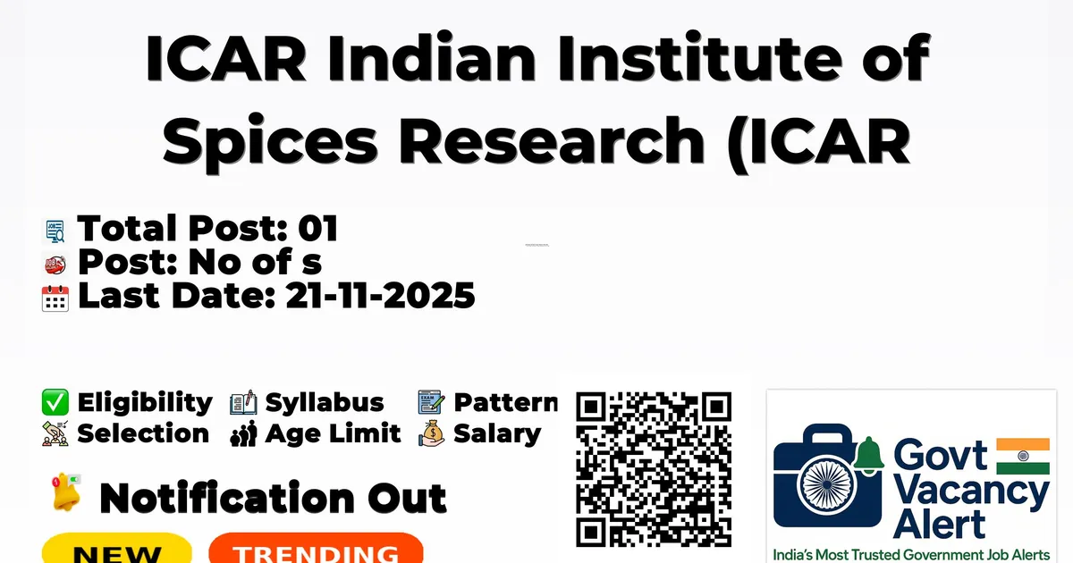 Company Name ICAR Indian Institute of Spices Research (ICAR IISR) Post Name Young Professional I No of Posts 01 Salary Rs.30,000/- Qualification Bachelors Degree Age Limit 21 to 45 years Start Date for Apply 07-11-2025 Last Date for Apply 21-11-2025 Official Website spices.res.in