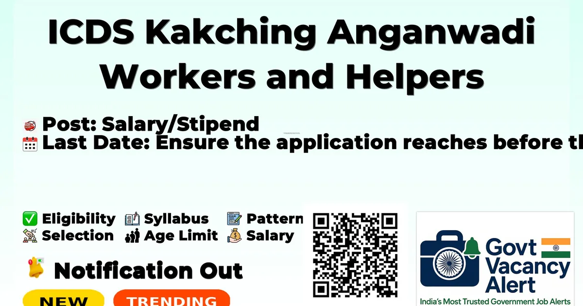 Organization Name Integrated Child Development Services Kakching (ICDS Kakching) Post Name Anganwadi Workers and Anganwadi Helpers Number of Posts 78 Advertisement Number DEV-KC-101/1/2026-DC(KCG)-KAK Salary Rs. 5,500/- per month (AWWs) and Rs. 3,100/- per month (AWHs) Qualification Class XII passed Age Limit 18-35 years as on 18-02-2026 Notification Date 18-02-2026 Last Date to Apply 28-02-2026 Application Mode Offline Job Type Contract