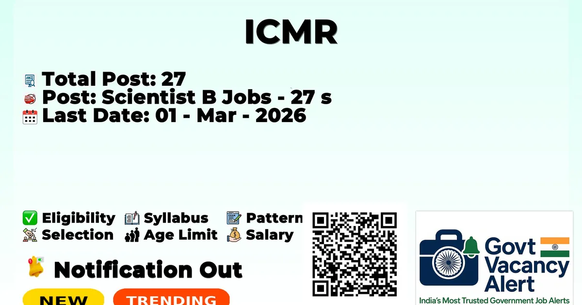 The Indian Council of Medical Research (ICMR) has officially released the notification to fill the vacancies of 27 Scientist B Posts. Interested and eligibile candidates can use this opportunity to apply for these posts before the last date of application. Candidates who have completed their B.E./B. Tech, M.E./M. Tech, MCA, and M. Pharm can apply for the ICMR Notification 2026. The interested applicants can apply in online mode. Here we have mentioned the education details, age limit, selection process, application fee, salary, and how to apply for these posts before the deadline. The application dates have already begun.