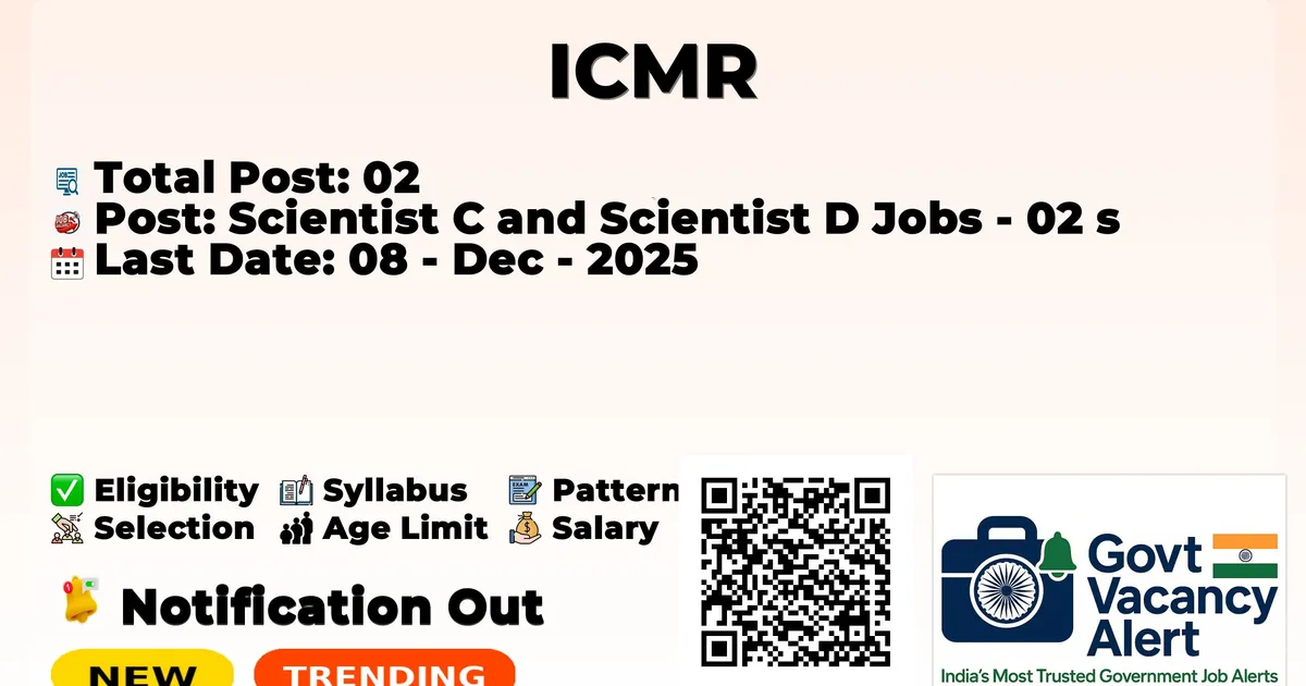 The Indian Council of Medical Research (ICMR) has declared the official notification for 2025. To fill up the vacancies for 02 Scientist C and Scientist D Jobs. Those candidates who have qualified in the Post Graduation, Pharm D, and MBBS can grab this chance and apply for these posts. Interested and eligible candidates can apply before the last date of application. Here, we mentioned the age limit, selection process, salary structure, education details, application fee, and how to apply for the ICMR Recruitment 2025.