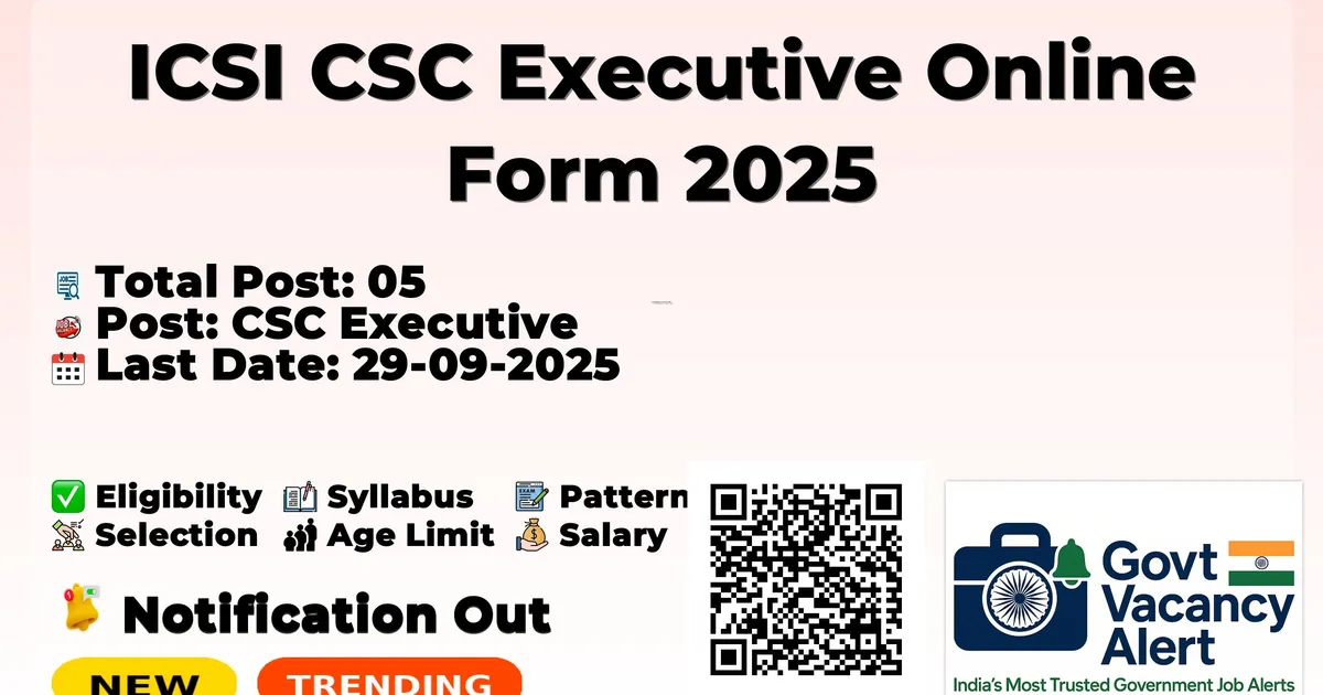 The Institute of Company Secretaries of India (ICSI) Recruitment 2025 for 05 posts of CSC Executive. Candidates with ICSI Can Apply Online. The online application opens on 15-09-2025, and closes on 29-09-2025. The candidate shall apply online through ICSI website, icsi.edu.