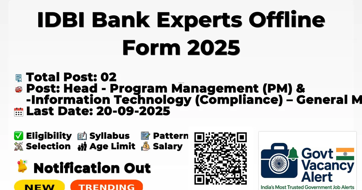 IDBI Bank Experts Offline Form 2025 — Head - Program Management (PM) & Information Technology (Compliance) – General Manager Cadre,General Manager - IT & MIS