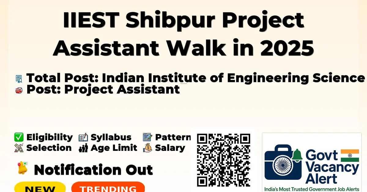 Indian Institute of Engineering Science and Technology, Shibpur (IIEST Shibpur) has released an official notification for Project Assistant Recruitment 2025. Eligible candidates can apply for 1 vacancy under a consultancy project in the Department of Civil Engineering from the date of notification till . Read the complete details about eligibility criteria, age limit, selection process, and how to apply below.