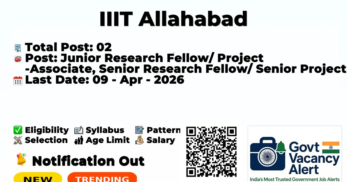 The Indian Institute of Information Technology Allahabad (IIIT Allahabad) has officially released the notification to fill the vacancies of 02 Junior Research Fellow and Senior Research Fellow Posts. Interested and eligibile candidates can use this opportunity to apply for these posts before the last date of application. Candidates who have completed their B.E./B. Tech, M.E./M. Tech can apply for the IIIT Allahabad Jobs 2026. The interested applicants can apply in offline mode. Here we have mentioned the education details, age limit, selection process, application fee, salary, and how to apply for these posts before the deadline. The application dates have already begun.
