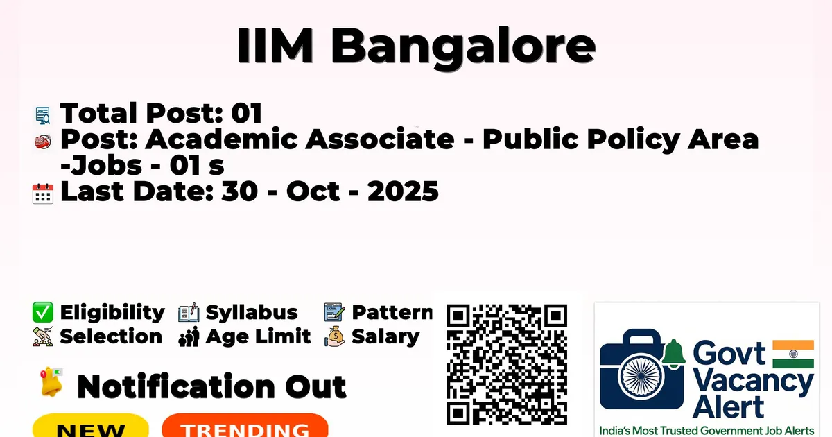 The Indian Institute of Management Bangalore (IIMB) has officially released the notification to fill the vacancies of 01 Academic Associate - Public Policy Area Posts. Interested and eligibile candidates can use this opportunity to apply for these posts before the last date of application. Candidates who have completed their Post-graduation can apply for the IIMB Jobs 2025. The interested applicants can apply in online mode. Here we have mentioned the education details, age limit, selection process, application fee, salary, and how to apply for these posts before the deadline. The application dates have already begun.