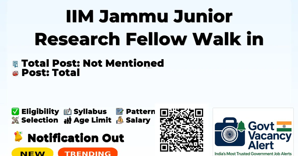 Indian Institute of Management Jammu (IIM Jammu) Recruitment 2025 for posts of Junior Research Fellow. Candidates with Any Graduate, Any Post Graduate Can attend the walkin. The Walk-in on 17-11-2025. For detailed information please visit IIM Jammu official website, iimj.ac.in.