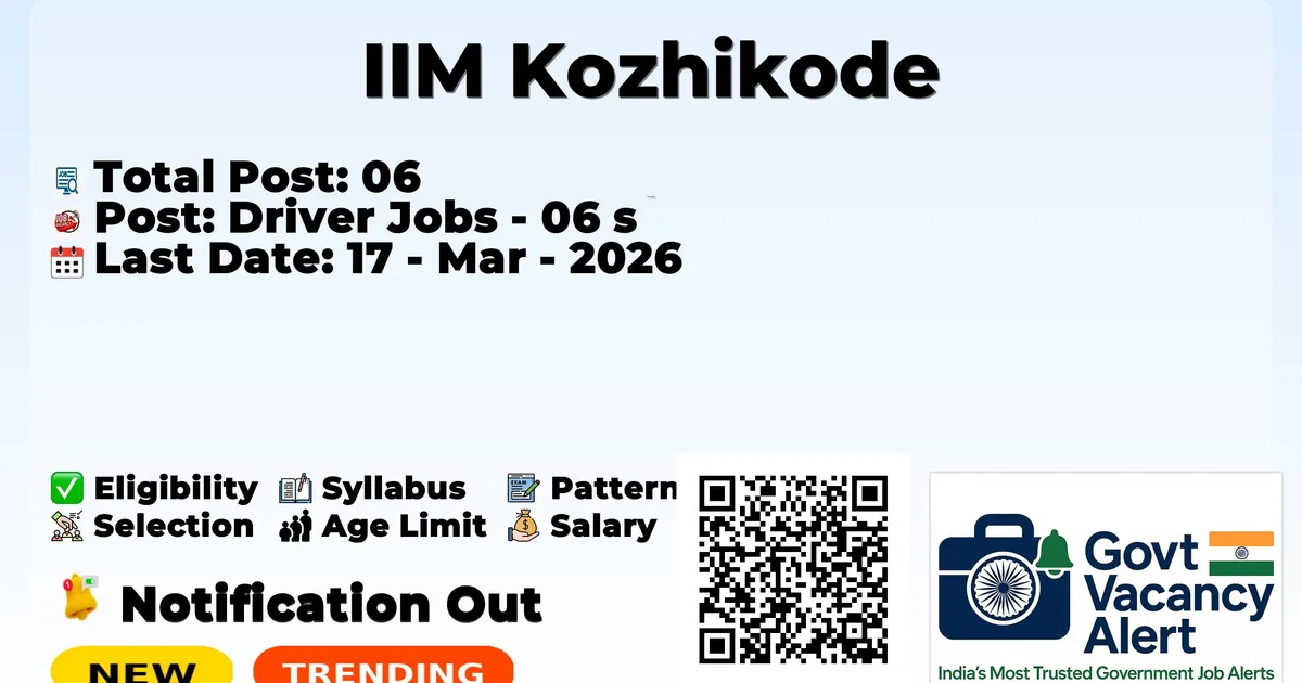 Indian Institute of Management Kozhikode (IIM Kozhikode) has officially released a notification for the recruitment of 6 Driver Posts. Those candidates who have qualified in the 10th Pass can grab this chance and apply for the IIM Kozhikode Recruitment 2026. Here, we include the age limit, selection process, and salary structure, education details, application fee, and apply for these posts.