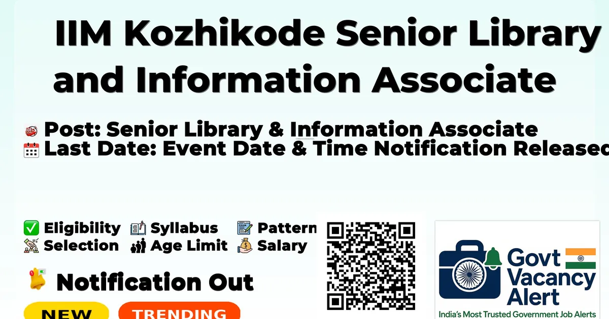 Indian Institute of Management Kozhikode (IIM Kozhikode) has released an official notification for the recruitment of 01 Senior Library and Information Associate Posts. Interested and eligible candidates can apply Online through the official IIM Kozhikode website. The last date to submit the application form is 18-12-2025. In this article, you’ll find the IIM Kozhikode Senior Library and Information Associate Posts recruitment details, including eligibility criteria, age limit, salary structure, selection process, application steps, and direct links to the official notification and Online application form.