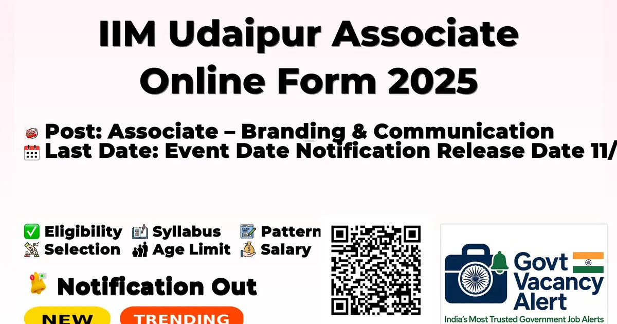 Indian Institute of Management Udaipur (IIM Udaipur) has released an official notification for the recruitment of 01 Associate Posts. Interested and eligible candidates can apply Online through the official IIM Udaipur website. The last date to submit the application form is 25-11-2025. In this article, you’ll find the IIM Udaipur Associate Posts recruitment details, including eligibility criteria, age limit, salary structure, selection process, application steps, and direct links to the official notification and Online application form.