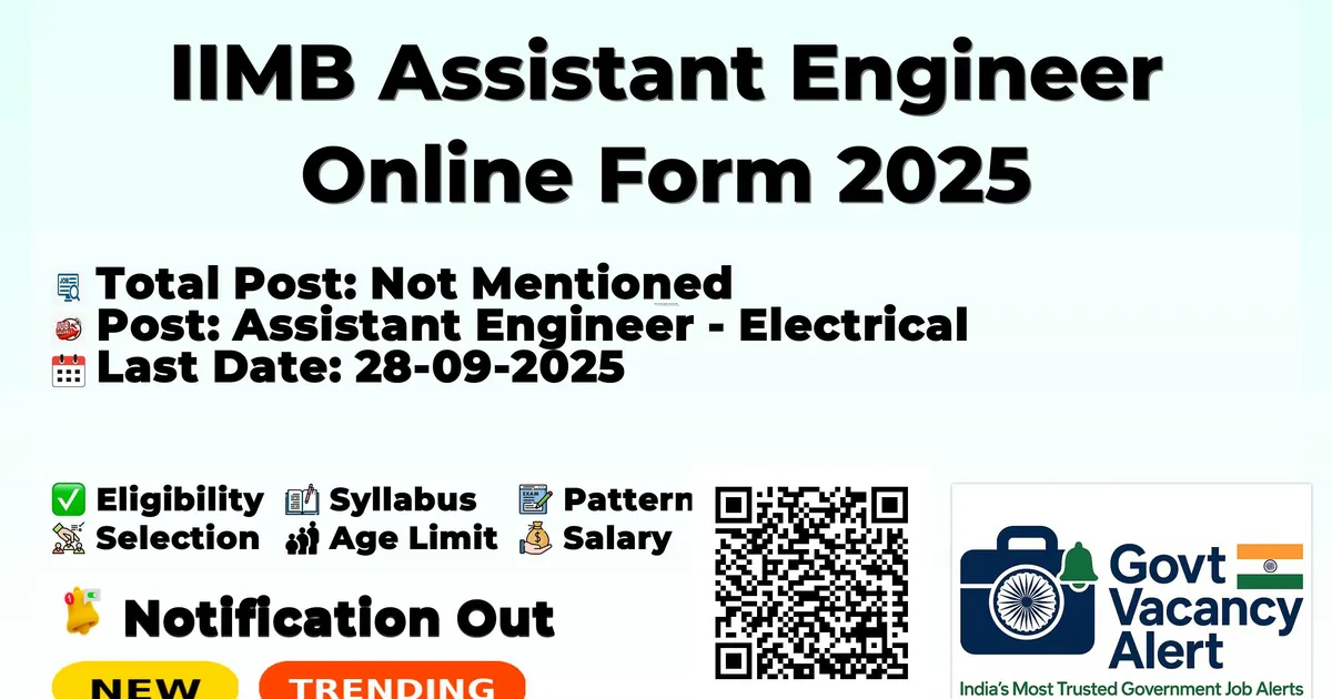 The Indian Institute of Management Bangalore (IIMB) Recruitment 2025 for posts of Assistant Engineer. Candidates with B.Tech/B.E, Diploma Can Apply Online. The online application opens on 12-09-2025, and closes on 28-09-2025. The candidate shall apply online through IIMB website, iimb.ac.in.