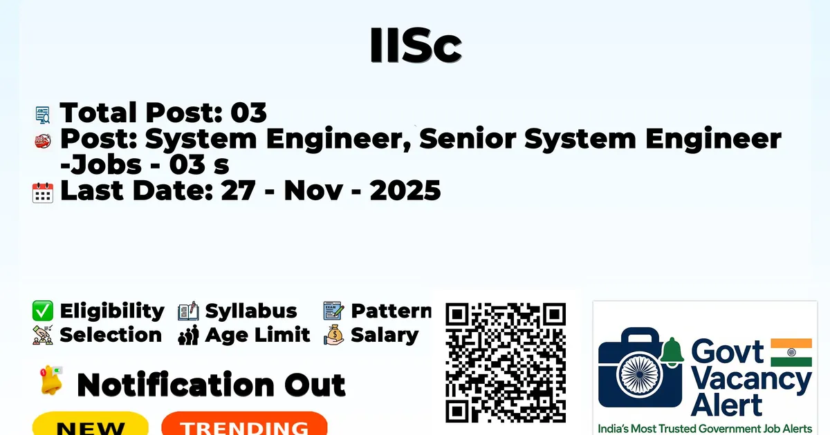 The Indian Institute of Science, Bangalore (IISc Bangalore) has officially released the notification to fill the vacancies of 03 System Engineers, Senior System Engineers. Interested and eligibile candidates can use this opportunity to apply for these posts before the last date of application. Candidates who have completed their B.E./B. Tech in Electrical, Mechanical Engineering can apply for the IISc Notification 2025. The interested applicants can apply in online mode. Here we have mentioned the education details, age limit, selection process, application fee, salary, and how to apply for these posts before the deadline. The application dates have already begun.