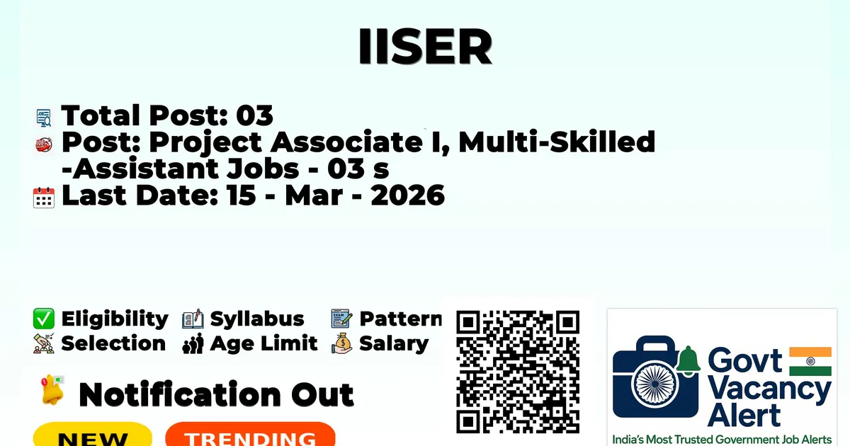The Indian Institute of Science Education and Research Pune (IISER Pune) has officially released the notification to fill the vacancies of 03 Project Associate I, Multi-Skilled Assistant Jobs. Interested and eligibile candidates can use this opportunity to apply for these posts before the last date of application. Candidates who have completed their Any Degree, B.E./B. Tech and Post-graduation students can apply for the IISER Pune Jobs 2026. The interested applicants can apply in online mode. Here we have mentioned the education details, age limit, selection process, application fee, salary, and how to apply for these posts before the deadline. The application dates have already begun.