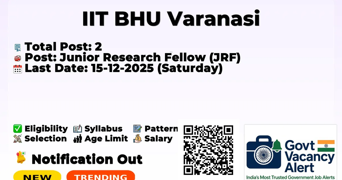 Indian Institute of Technology (Banaras Hindu University) (IIT BHU) has released an official notification for the recruitment of 02 Junior Research Fellow Posts. Interested and eligible candidates can apply Online through the official IIT BHU website. The last date to submit the application form is 15-12-2025. In this article, you’ll find the IIT BHU Junior Research Fellow Posts recruitment details, including eligibility criteria, age limit, salary structure, selection process, application steps, and direct links to the official notification and Online application form.