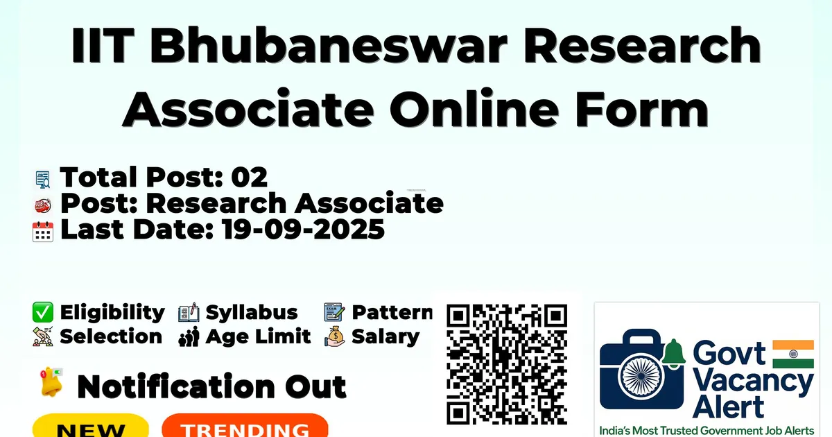 The Indian Institute of Technology, Bhubaneswar (IIT Bhubaneswar) Recruitment 2025 for 02 posts of Research Associate. Candidates with B.Tech/B.E Can Apply Online. The online application opens on 09-09-2025, and closes on 19-09-2025. The candidate shall apply online through IIT Bhubaneswar website, iitbbs.ac.in.