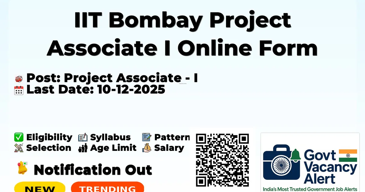 Indian Institute of Technology Bombay (IIT Bombay) has released an official notification for the recruitment of 02 Project Associate I Posts. Interested and eligible candidates can apply Online through the official IIT Bombay website. The last date to submit the application form is 10-12-2025. In this article, you’ll find the IIT Bombay Project Associate I Posts recruitment details, including eligibility criteria, age limit, salary structure, selection process, application steps, and direct links to the official notification and Online application form.