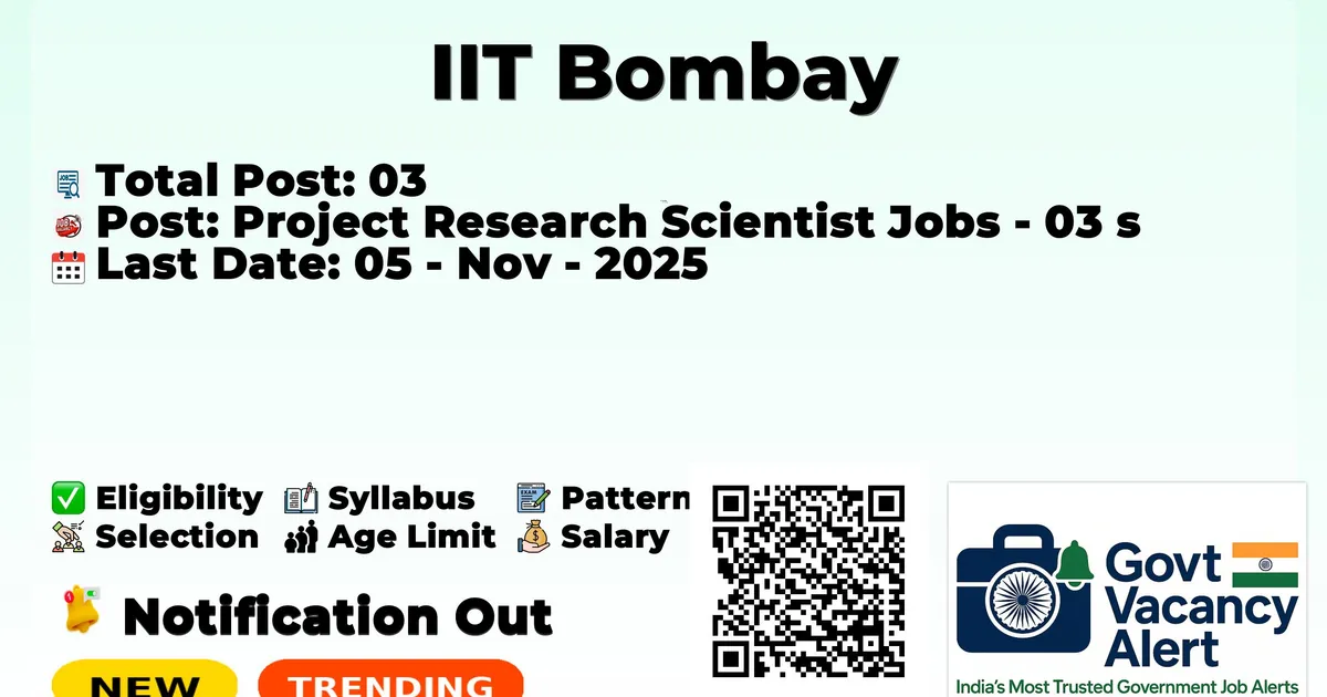 Indian Institute of Technology Bombay (IIT Bombay) has released the official notification for 2025. To fill up the vacancies for 03 Project Research Scientist Jobs. Those candidates who have qualified in the B.E/ B.Tech, M.E/ M.Tech, MBBS, MD/ MS, Post Graduation, or Any Degree can grab this chance and apply for the IIT Bombay Recruitment 2025. Here, we mentioned the age limit, selection process, salary structure, education details, application fee, and how to apply for these posts. Interested candidates can apply on or before the last date of application.