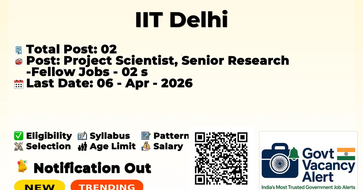 The Indian Institute of Technology Delhi (IIT Delhi) has officially released the notification to fill the vacancies of 02 Project Scientist and Senior Research Fellow Posts. Interested and eligible candidates can use this opportunity to apply for these posts before the last date of application. Candidates who have completed their M.E./M. Tech, Ph.D., can apply for the IIT Delhi Jobs 2026. The interested applicants can apply in offline mode. Here we have mentioned the education details, age limit, selection process, application fee, salary, and how to apply for these posts before the deadline. The application dates have already begun.