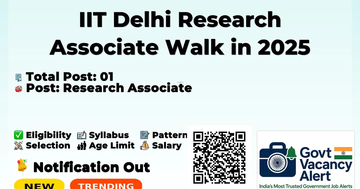 Indian Institute of Technology Delhi (IIT Delhi) Recruitment 2025 for 01 posts of Research Associate. Candidates with M.Phil/Ph.D Can attend the walkin. The Walk-in on 19-09-2025. For detailed information please visit IIT Delhi official website, ird.iitd.ac.in.