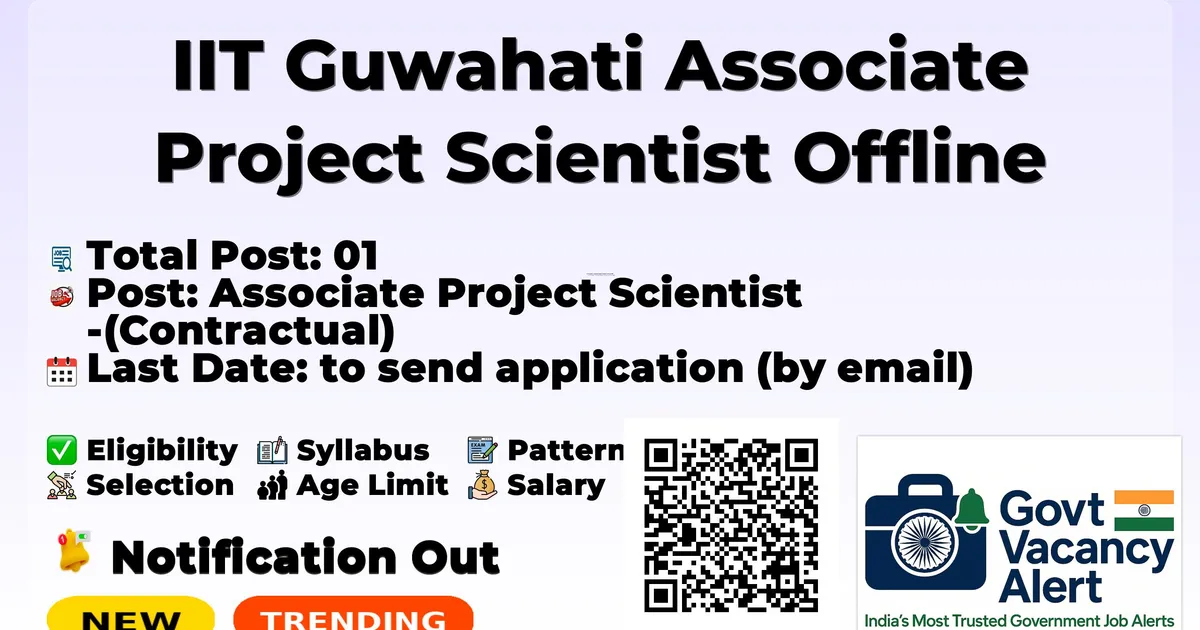 Indian Institute of Technology Guwahati (IIT Guwahati) has released an official notification for the recruitment of 01 Associate Project Scientist Posts. Interested and eligible candidates can apply Offline through the official IIT Guwahati website. The last date to submit the application form is 25-11-2025. In this article, you’ll find the IIT Guwahati Associate Project Scientist Posts recruitment details, including eligibility criteria, age limit, salary structure, selection process, application steps, and direct links to the official notification and Offline application form.