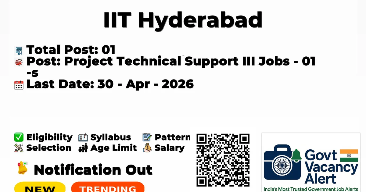Indian Institute of Technology ( IIT) Hyderabad has declared the official notification for 2026. To fill up the various vacancies for Project Technical Support III Jobs. Those candidates who have qualified in the B.E/ B.Tech, M.E/ M.Tech, and M.Pharm can grab this chance and apply for the IIT Hyderabad Notification 2026. Here we included the age limit, selection process, salary structure, education details, applciation fee, and how to apply for these posts.