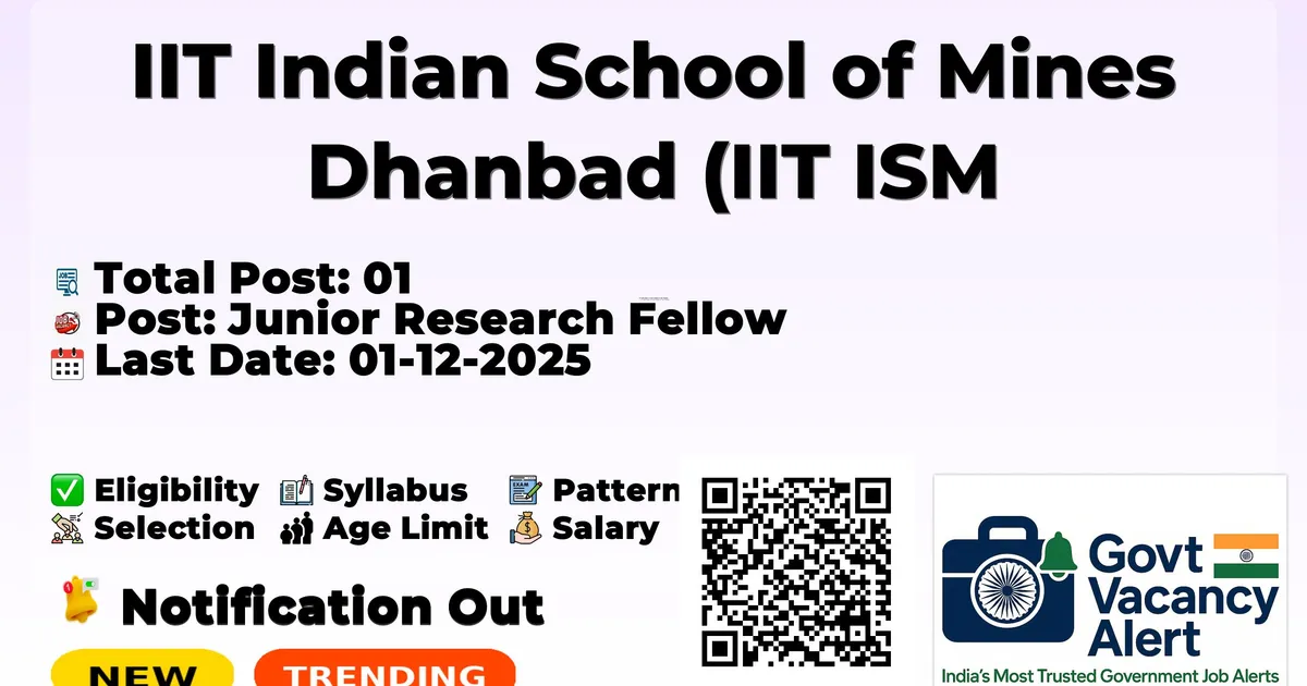IIT Indian School of Mines Dhanbad (IIT ISM Dhanbad) has released an official notification for the recruitment of 01 Junior Research Fellow Posts. Interested and eligible candidates can apply Offline through the official IIT ISM Dhanbad website. The last date to submit the application form is 01-12-2025. In this article, you’ll find the IIT ISM Dhanbad Junior Research Fellow Posts recruitment details, including eligibility criteria, age limit, salary structure, selection process, application steps, and direct links to the official notification and Offline application form.