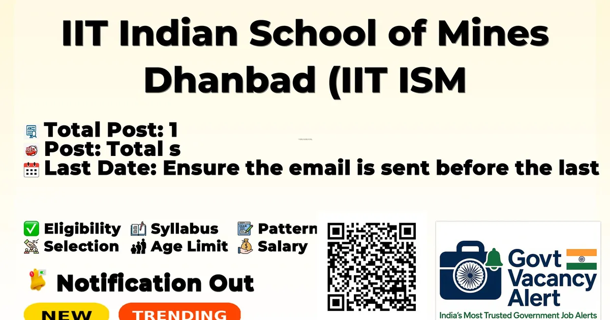 IIT Indian School of Mines Dhanbad (IIT ISM Dhanbad) has officially released a notification for the recruitment of 1 Junior Research Fellow (JRF) Posts. This recruitment drive offers a great opportunity for candidates looking for government jobs. Interested and eligible candidates can apply by sending their resume and documents to the official email address.