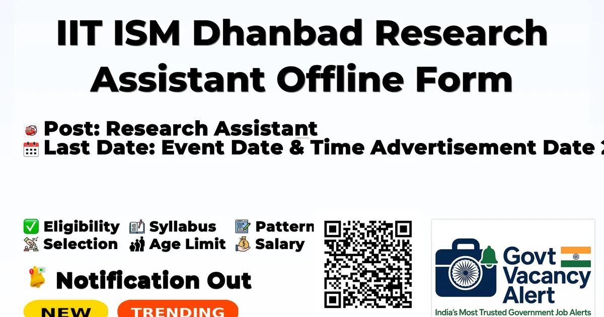 IIT Indian School of Mines Dhanbad (IIT ISM Dhanbad) has released an official notification for the recruitment of 01 Research Assistant Posts. Interested and eligible candidates can apply Offline through the official IIT ISM Dhanbad website. The last date to submit the application form is 09-02-2026. In this article, you’ll find the IIT ISM Dhanbad Research Assistant Posts recruitment details, including eligibility criteria, age limit, salary structure, selection process, application steps, and direct links to the official notification and Offline application form.