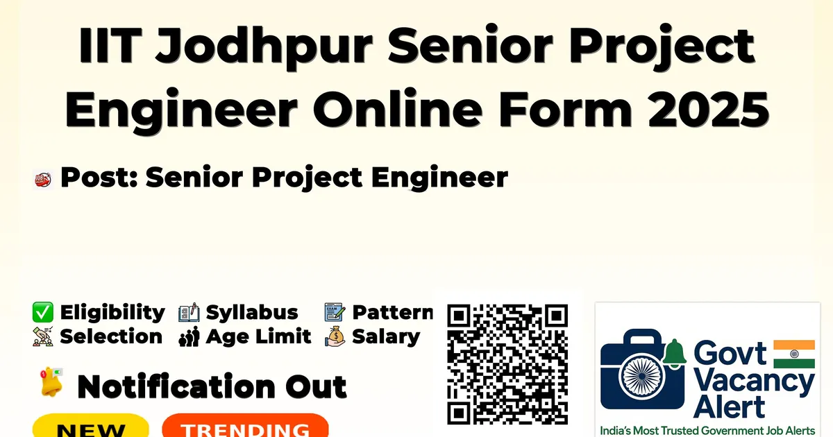 Details Information Organization Name Indian Institute of Technology Jodhpur (IIT Jodhpur) Post Name Senior Project Engineer Total Vacancies 02 Posts Salary/Pay Scale Rs. 45000 Educational Qualification M.E/M.Tech, M.Phil/Ph.D Age Limit 40 years (Age relaxation as per rules) Application Start Date 02-12-2025 Application End Date 17-12-2025 Application Mode Online Official Website iitj.ac.in