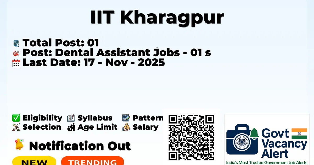 Indian Institute of Technology Kharagpur (IIT Kharagpur) has announced the official notification for 2025. To fill up the vacancies for Dental Assistant Jobs. Those candidates who have qualified in the BDS can grab this chance and apply for these posts. Here, we include the age limit, selection process, salary structure, education details, application fee, and how to apply for the IIT Kharagpur Recruitment 2025. Interested and eligible candidates can attend the walk-in at the venue given below.