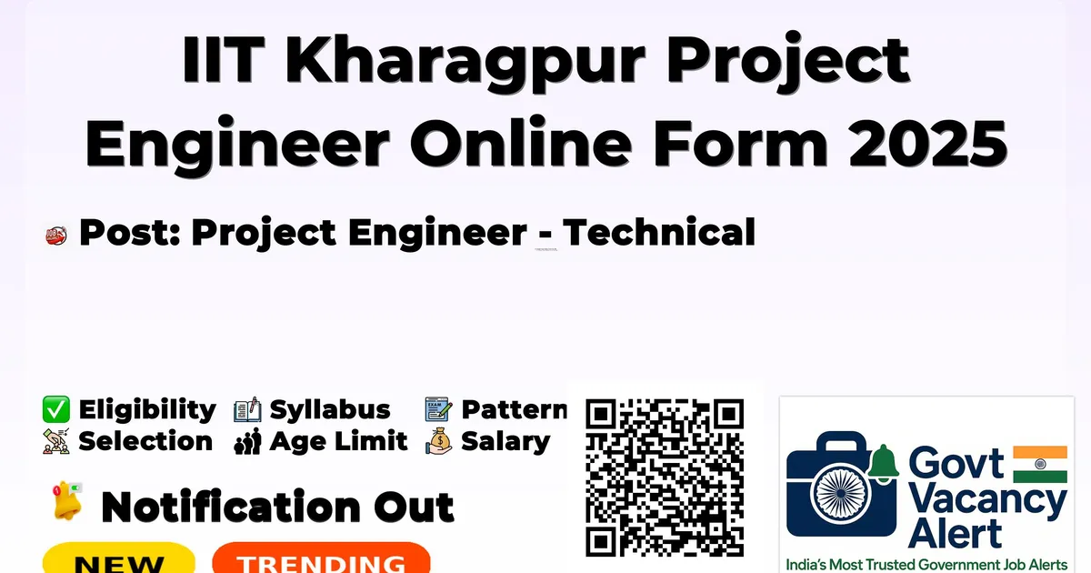 Details Information Organization Name Indian Institute of Technology Kharagpur (IIT Kharagpur) Post Name Project Engineer - Technical Total Vacancies 1 Post Salary/Pay Scale Consolidated compensation up to Rs. 54,000 per month (depending on qualification and experience) Educational Qualification Four years Bachelor’s degree in Engineering or Technology from a recognized University or equivalent with two years experience OR Master’s Degree in Engineering or Technology from a recognized University or equivalent Age Limit Upper age limit 40 years (age as on last date of advertisement) Application Start Date 26/11/2025 Application End Date 09/12/2025 Application Mode Online Official Website iitkgp.ac.in