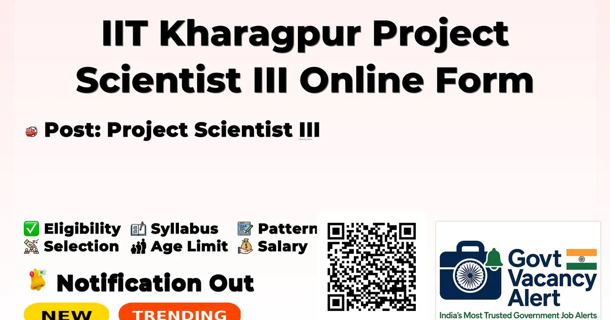 Details Information Organization Name Indian Institute of Technology Kharagpur (IIT Kharagpur) Post Name Project Scientist III Total Vacancies 01 Posts Salary/Pay Scale Rs. 107000 Educational Qualification M.E/M.Tech, M.Phil/Ph.D Age Limit 45 years (Age relaxation as per rules) Application Start Date 26-11-2025 Application End Date 09-12-2025 Application Mode Online Official Website iitkgp.ac.in