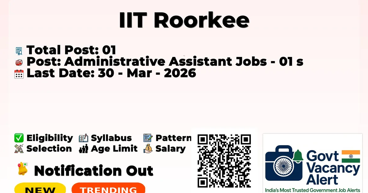 The Indian Institute of Technology Roorkee (IIT Roorkee) has officially released the notification to fill the vacancies of 01 Administrative Assistant Posts. Interested and eligibile candidates can use this opportunity to apply for these posts before the last date of application. Candidates who have completed any degree can apply for the IIT Roorkee Jobs 2026. The interested applicants can attend the walk-in interview. Here we have mentioned the education details, age limit, selection process, application fee, salary, and how to apply for these posts before the deadline. The application dates have already begun.