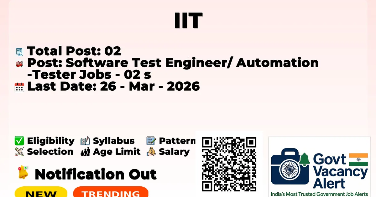 The Indian Institute of Technology Madras (IIT Madras) has officially released the notification to fill the vacancies of 02 Software Test Engineer/ Automation Tester Jobs. Interested and eligibile candidates can use this opportunity to apply for these posts before the last date of application. Candidates who have completed their B.E./B. Tech in Computer Science Engineering, MCA, and M.Sc can apply for the IIT Madras Jobs 2026. The interested applicants can apply in online mode. Here we have mentioned the education details, age limit, selection process, application fee, salary, and how to apply for these posts before the deadline. The application dates have already begun.